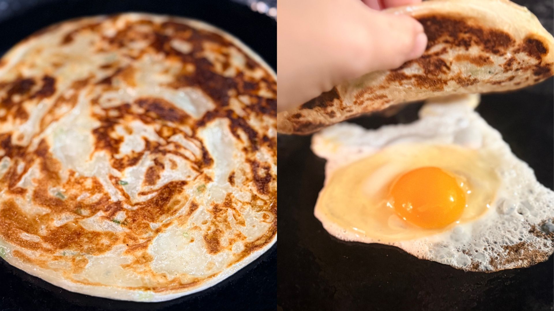 Crack an egg or 2 in the pan with some oil and press the pancake directly on top so it sticks. Cook a minute or so until you’ve cooked your egg to your preference.